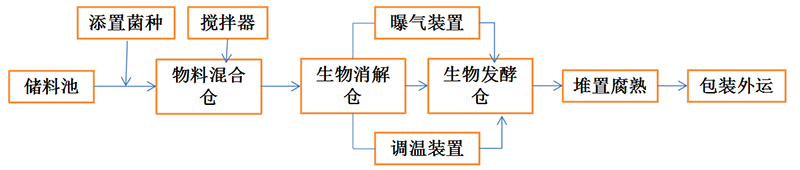 本著程序少、操作性強及用工少的原則,主要在“一池兩倉”中進行,“一池”指的是儲料池,“兩倉” 分別是指物料混合倉和生物消解發(fā)酵倉。